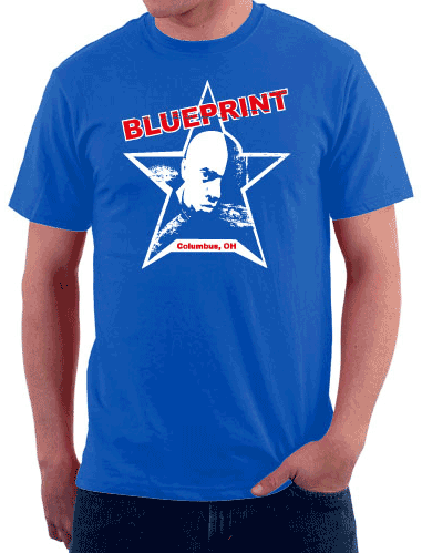 Blueprint “Blue Star” t-shirt design.  Light blue shirt with red and white print