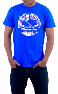 Weathered, circular, Blueprint face design. Royal blue shirt with red and white print.